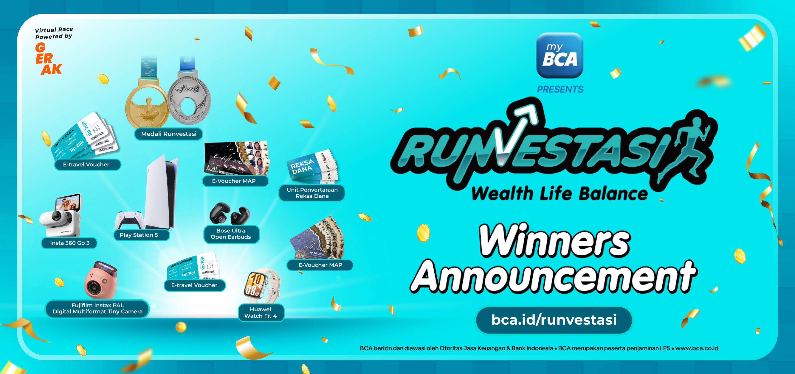 Ikuti Runvestasi dan menangkan berbagai hadiah berharga dengan menjadi finisher pada Aplikasi GERAK dari tanggal 2-17 November 2025 dan menyelesaikan tantangan Investment Challenge pada aplikasi myBCA pada 22 Agustus - 17 November 2025. Ayo daftarkan diri kamu segera melalui aplikasi GERAK dan dapatkan ribuan hadiah menariknya!
